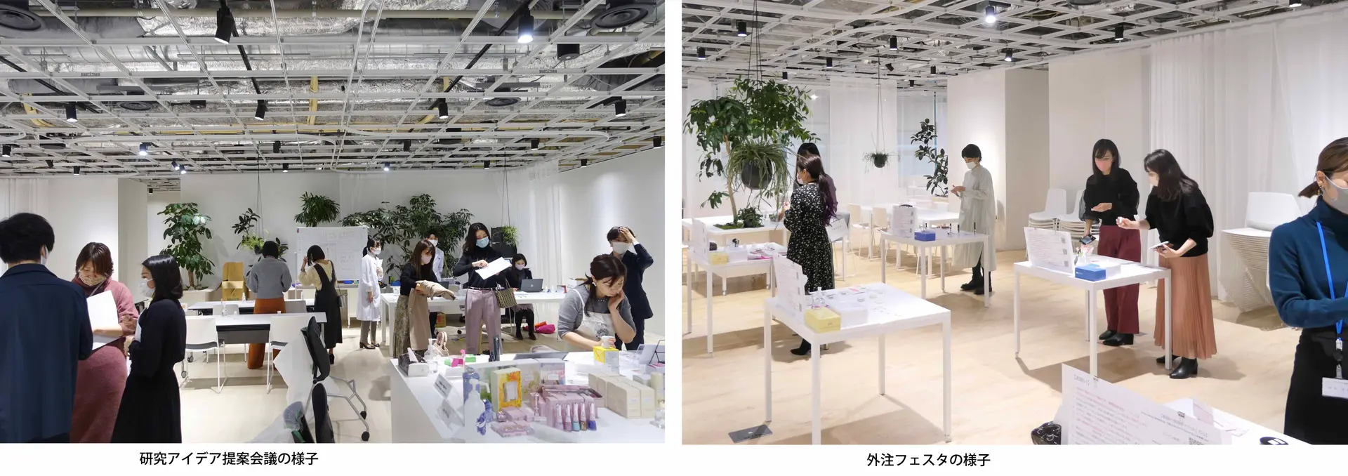 今回、その「KoCoLabo」のさらなる活用の一環として11月24日~27日に「モノづくりウィーク」を開催。25日は、これまで長年に亘り実施してきた、個々の研究員の独自のアイデアを形にして提案し、企画や開発をはじめとした部門のインスピレーションを刺激する「研究アイデア提案会議」、26日~27日は、協力パートナーである取引先の技術と同社のアイデアを結びつける「外注フェスタ」を実施。これまで別々に実施してきたこの2つのイベントを、一週間の中に集約し、また日本橋本社「KoCoLabo」にて行うことで、今までイベントに参加していなかった社員も集まり、例年以上に双方向の情報交換が行われた。