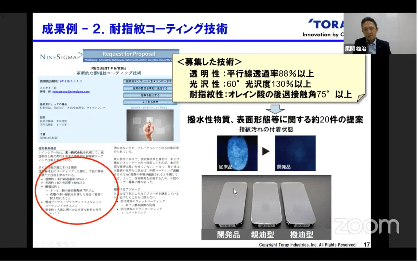 実際に、同社の指紋の付着しにくいフィルム開発において、ナインシグマ社を通じて世界中から技術を公募したところ、約20件の提案があったと話す。それらを組み合わせることで、早期に耐指紋コーティング技術を開発できたそうだ。自社内では3年近く進捗のなかった案件だが、外部に技術を求めることで、わずか半年程度で開発品を作ることができたとし、改めてオープンイノベーションには、圧倒的なスピードで課題解決ができるメリットがあると伝えた。