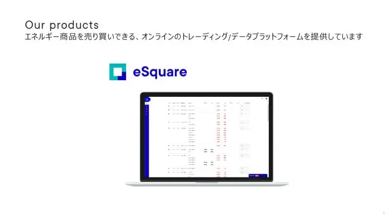同社は、「Building energy markets coloring your life」 をミッションとして掲げ、あらゆるユーザーが、オンライン上のマーケットプレイス(eSquare)にて、電力やLNGといったエネルギー商品を、ワンクリックで自由に売買できる世界の実現を目指すスタートアップ。
