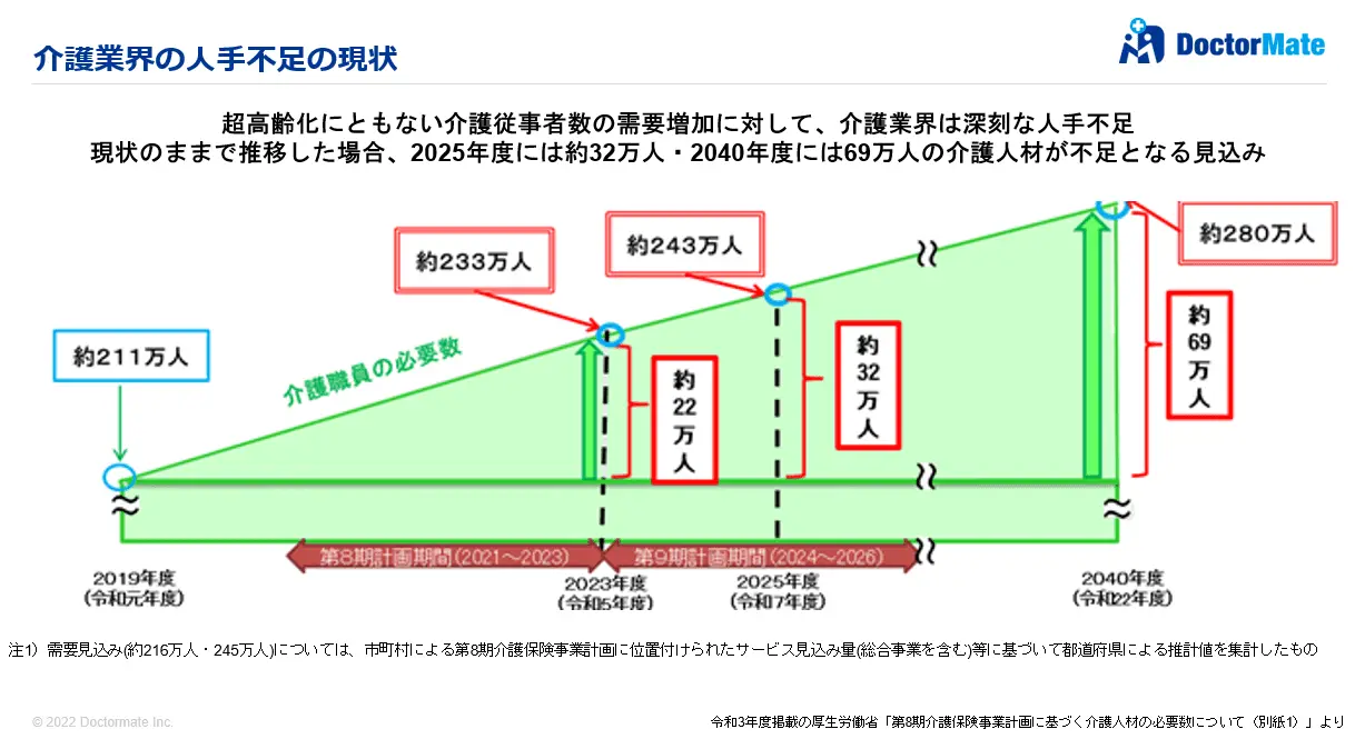 戦後すぐの第一次ベビーブーム(1947年~1949年)の時に生まれた、いわゆる「団塊の世代」800万人全員が75歳以上、つまり後期高齢者になる2025年には、約32万人の介護人材が不足することが予測されているが、2022年の現時点で、すでに介護現場は慢性的な人材不足の状況にある。