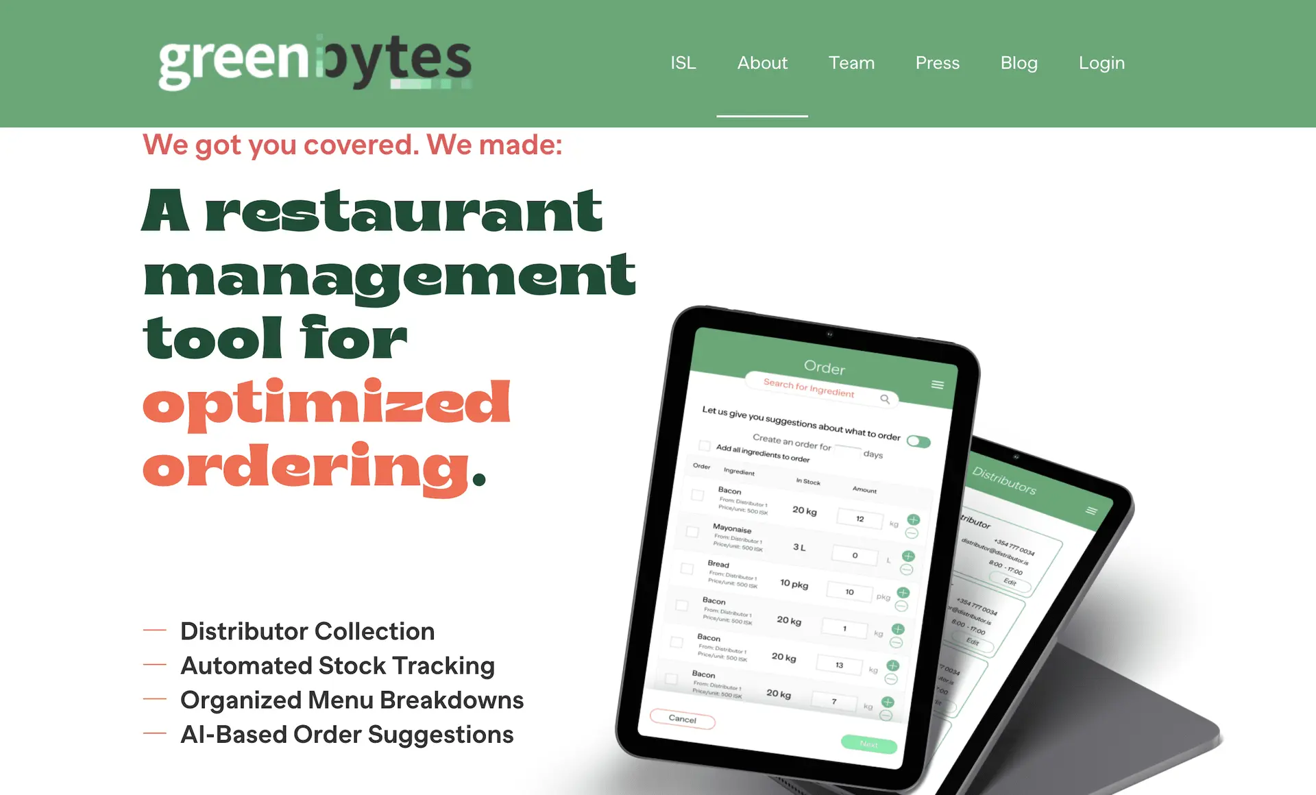 GreenBytesが解決しようとしている課題は、飲食店における食品廃棄物、特に原材料の過剰注文による廃棄物の削減だ。同社が開発するプラットフォームは、各飲食店の「注文すべき原材料の適正量」をアルゴリズムが導き出し、同時に注文データの送信も行える。