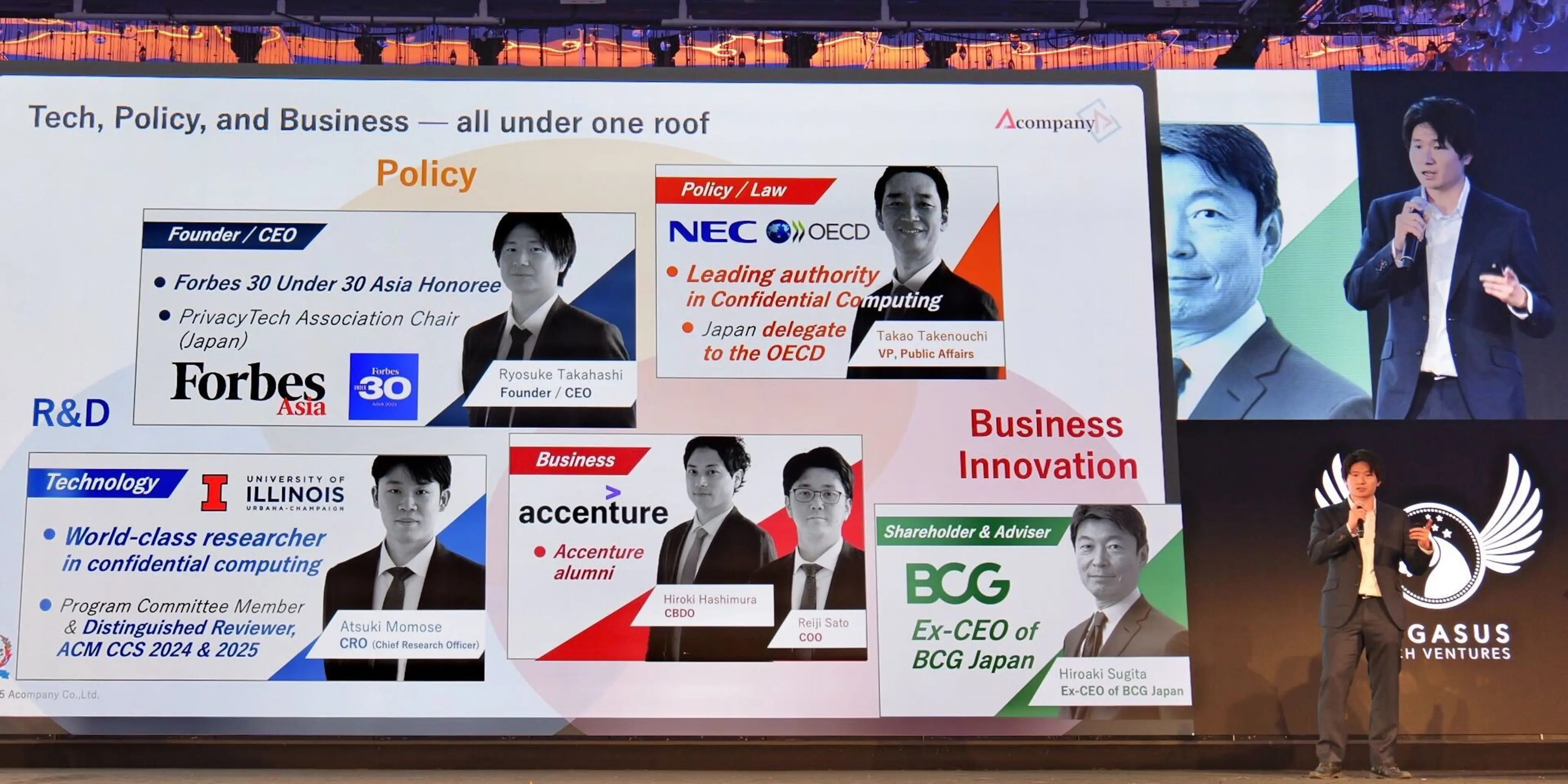 Acompanyは、暗号化されたまま企業データを生成AIで活用できる秘密計算AIクラウドを提供するスタートアップ。データ保護とAIセキュリティという世界的課題への実用的な解決策として評価を集め、世界の舞台で大きな存在感を放った。