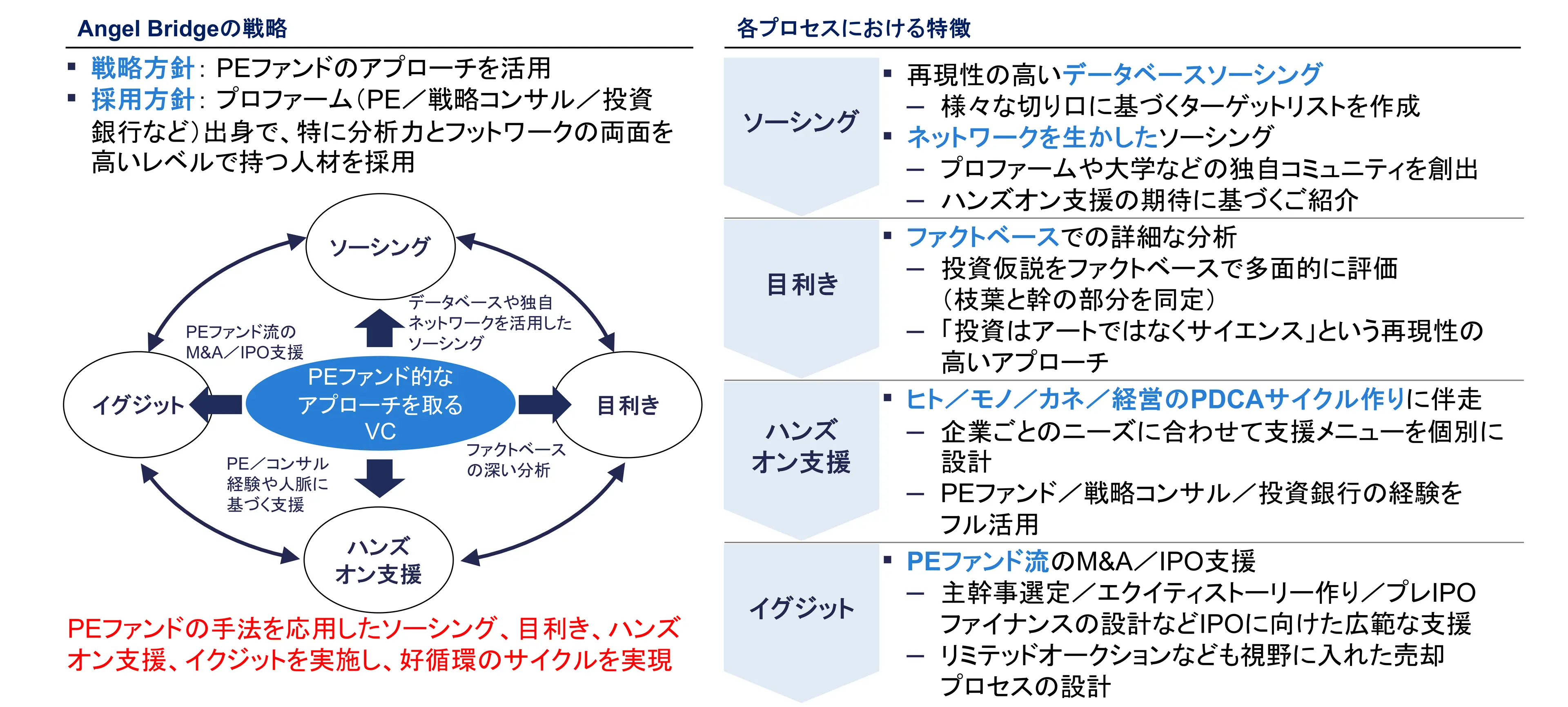 Angel Bridgeは、「資金を正しく投下し、正しく働かせる」を掲げ、PEファンド的手法を投資活動全体に取り入れている点が特徴だ。ファクトベースの事業分析を軸にした案件選定、優良スタートアップへの継続投資、ハンズオン支援、そして明確なイグジット戦略まで一貫して支援する。