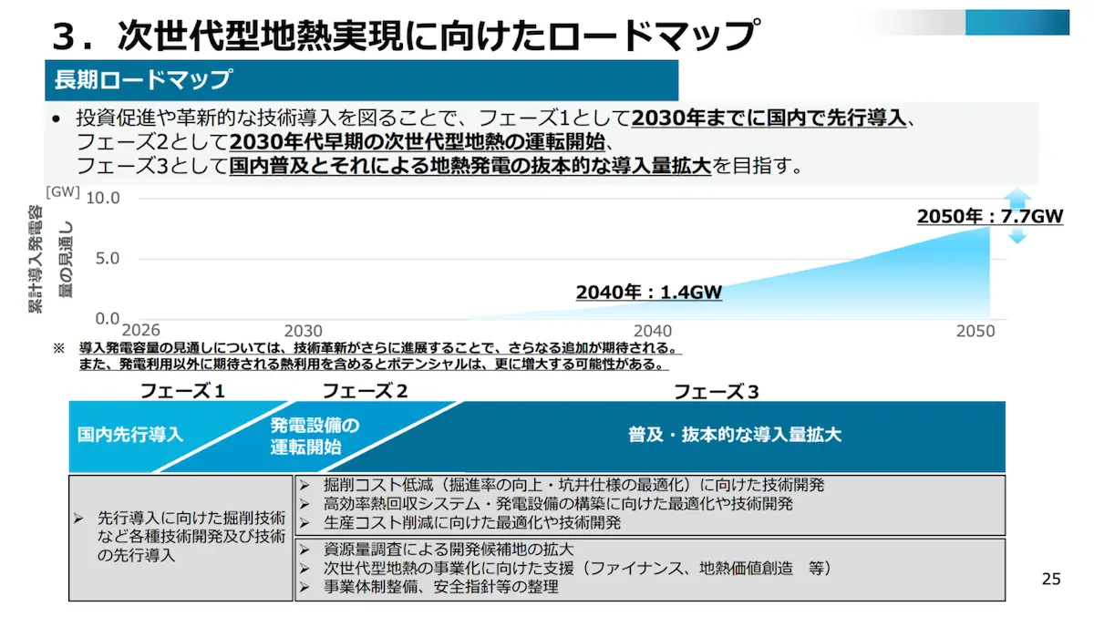 ・フェーズ1(〜2030年):掘削・熱回収技術の実証、国内先行導入の準備段階