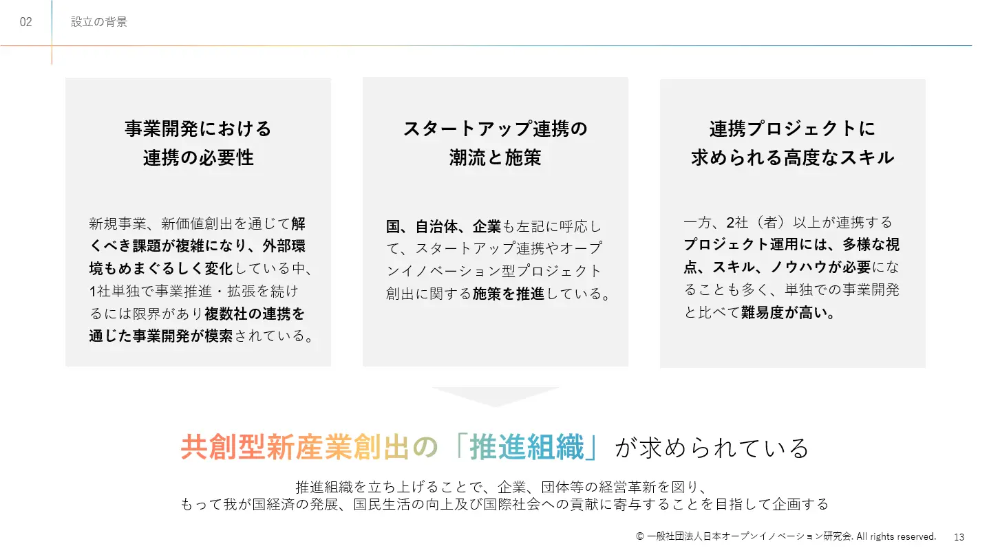 ――大企業の経営層からオープンイノベーションの支援会社、さらにはイノベーション研究の第一人者である米倉誠一郎氏など、理事や賛同者の顔ぶれも豪華ですよね。