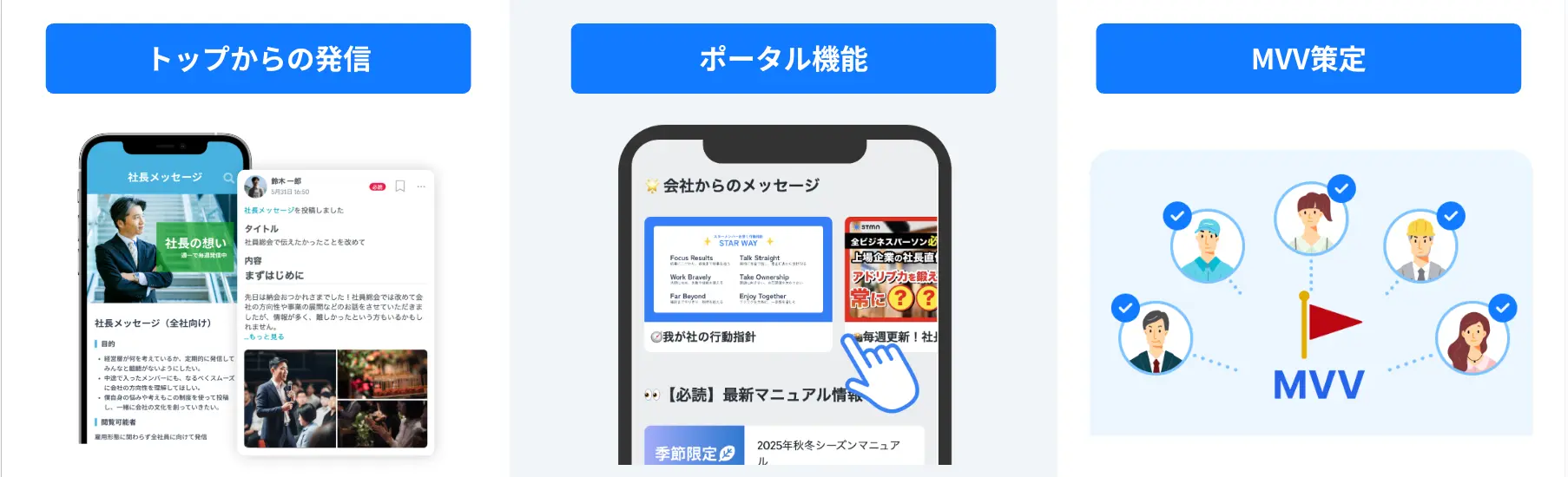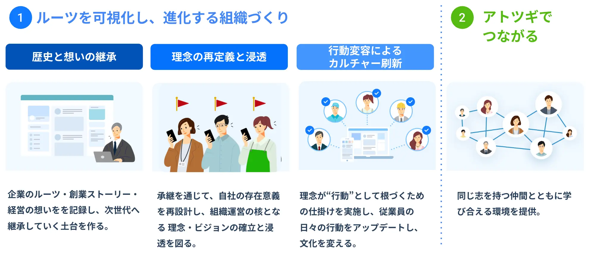 新たに提供される「TUNAGアトツギプラン」では、①創業者や先代の想い・歴史をデジタル資産として可視化・継承する仕組み、②理念やビジョンの再定義と浸透を支えるトップ発信やポータル機能、③行動変容を促すサンクスカードやサーベイを通じたカルチャー刷新、④TAKIBI&Co.との連携によるアトツギ同士の学び合いの場、という四つの柱を提供する。承継期に起こりがちな分断や停滞を、組織全体で乗り越える設計が特徴だ。