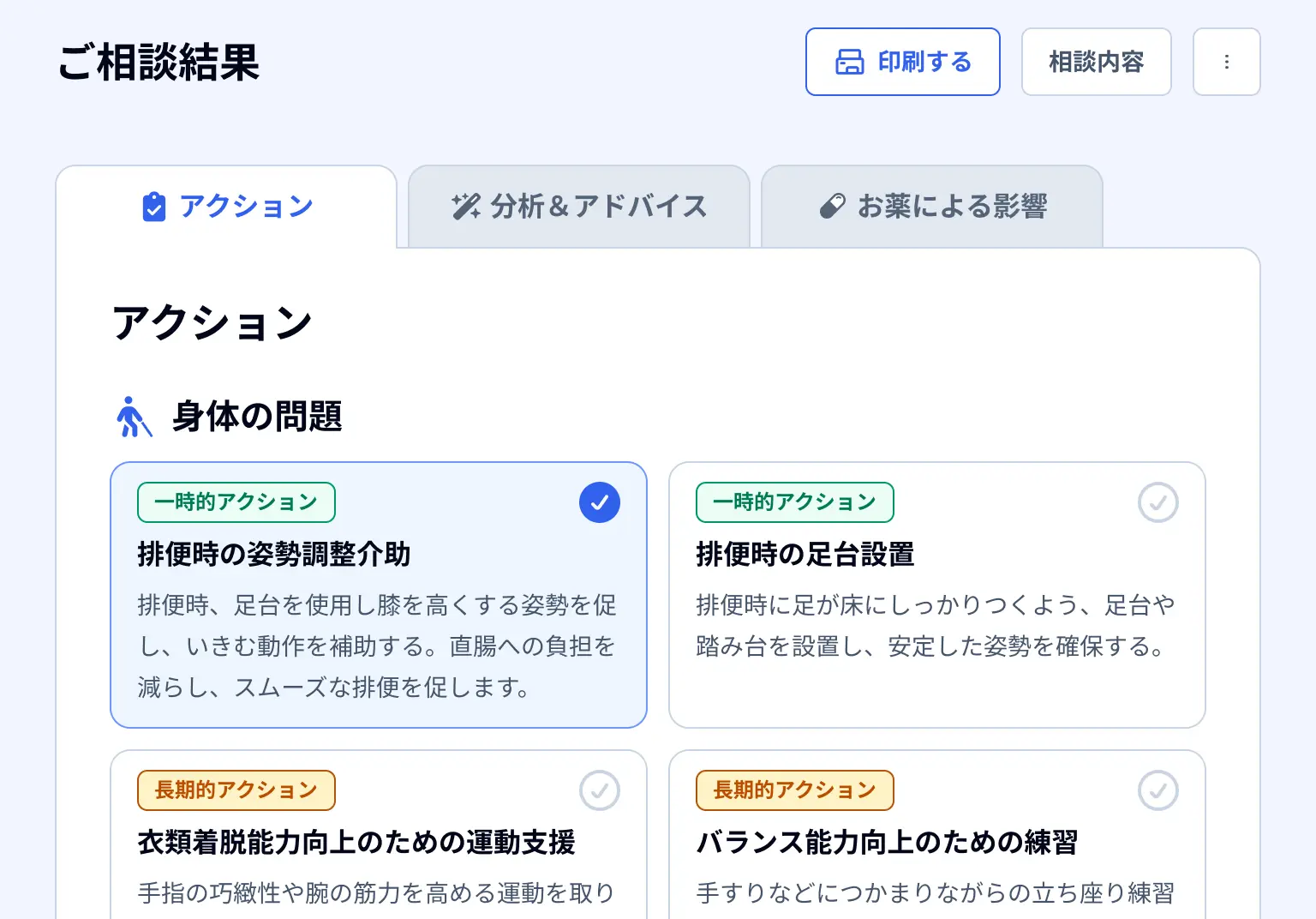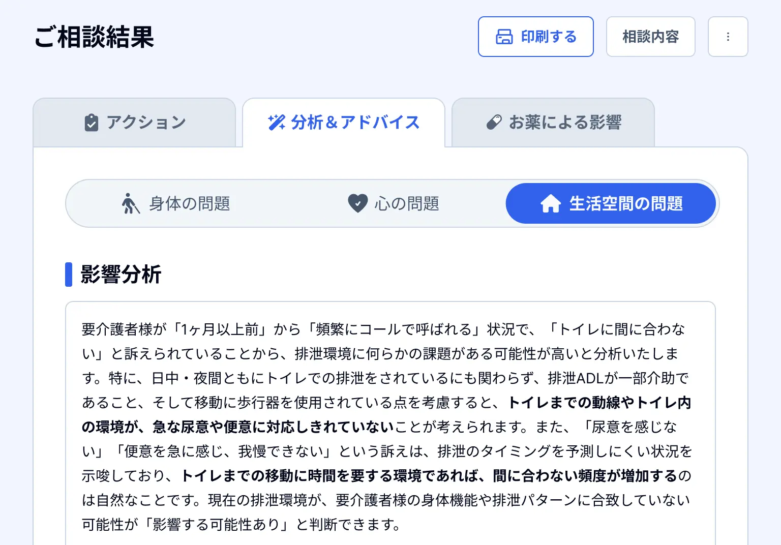 「教えて!排泄ケア」は、SOMPOケアが保有する介護マニュアルや事例、文献に加え、現場調査やインタビューを通じて得られた暗黙知を反映している点が特長だ。体調変化やケア方法に関する悩みに対し、服薬情報や既往歴、日常生活動作(ADL)、排泄状況など断片的な情報を統合的に分析。複数の要因を整理した「影響分析&アドバイス」として提示し、具体的な対策を複数提案する。