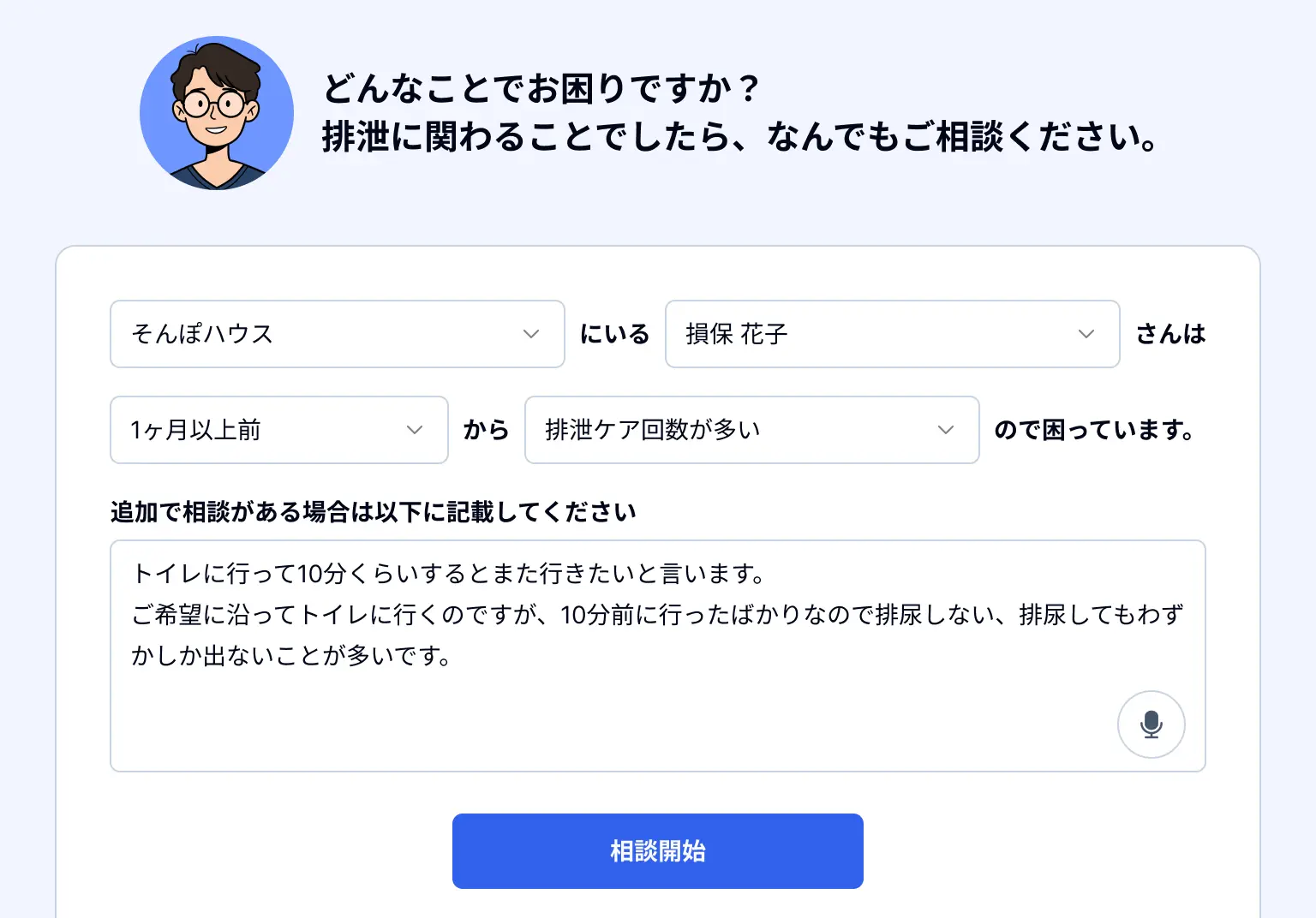 こうした課題を背景に、SOMPOケアが長年蓄積してきた介護現場の知見を生成AIに反映させた「教えて!KAiGO」が開発された。その中でも「教えて!排泄ケア」は、特に現場負荷が大きい排泄ケア領域に特化し、日々の判断や対応を高度に支援するサービスとして位置付けられている。