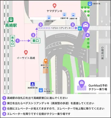 乗車当日は、新幹線eチケットを紐づけたSuicaで改札を通過すると、その情報がタクシー事業者に共有される。高崎駅到着後には、利用者のスマートフォンに専用タクシー乗り場の案内が届き、駅東口駅前広場高速バスターミナル内の専用乗り場からスムーズに乗車できる。