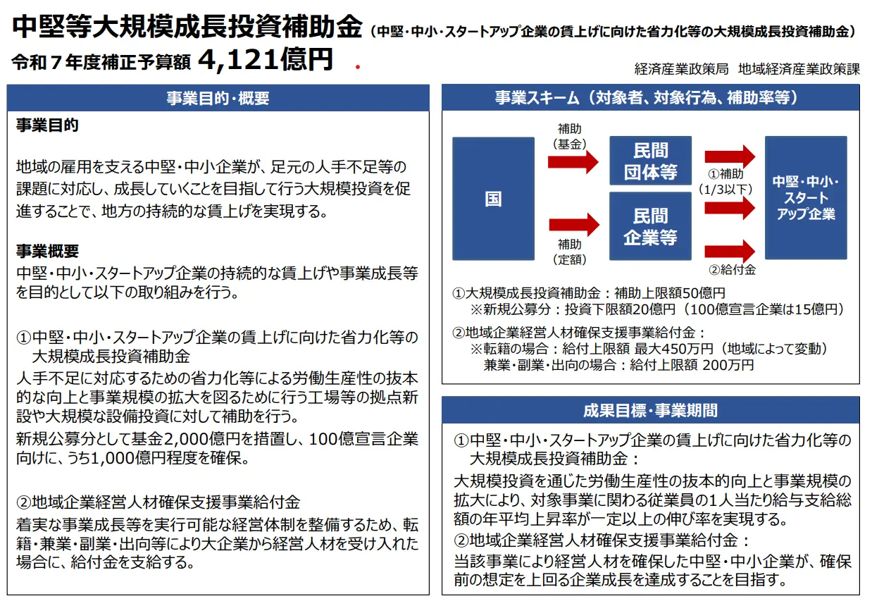 今回の補正予算案において、最大規模の支援施策として計上されたのが、「中堅等大規模成長投資補助金」だ。これは「中堅・中小・スタートアップ企業の賃上げに向けた省力化等の大規模成長投資補助金」を中心とする支援パッケージで、その規模と政策意図から成長投資策として注目される。