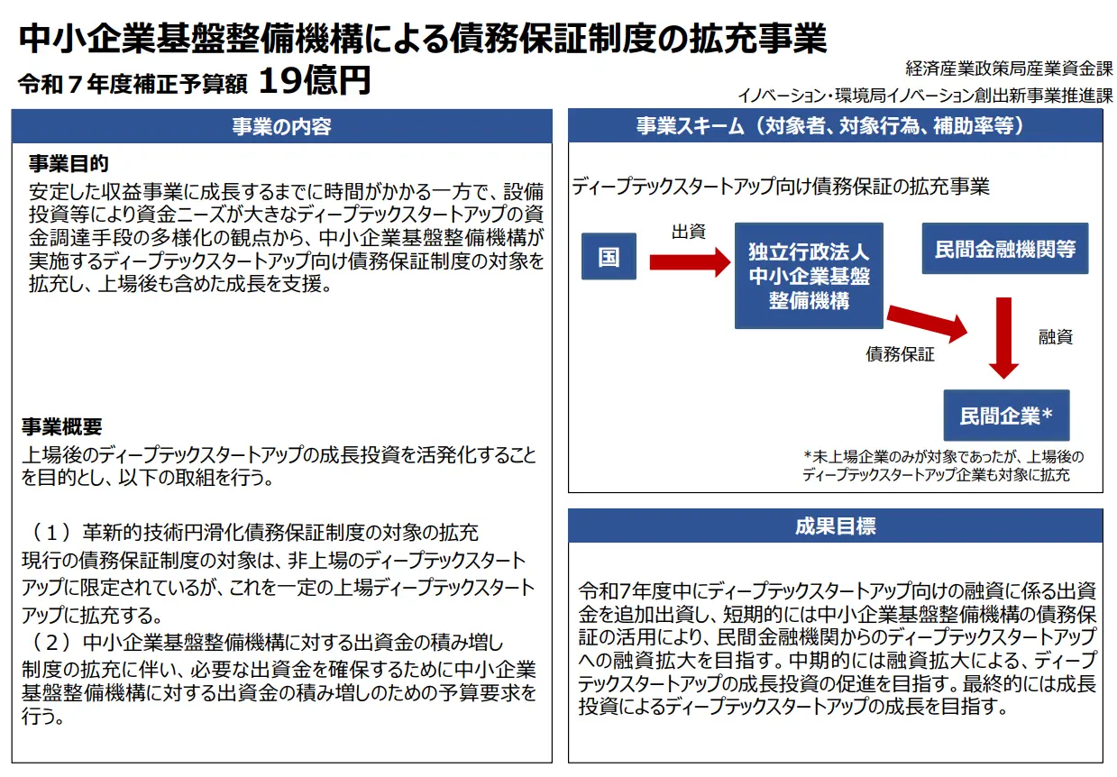 「中小企業基盤整備機構による債務保証制度の拡充事業」はディープテックスタートアップの資金調達手段を広げることを目的とした施策だ。