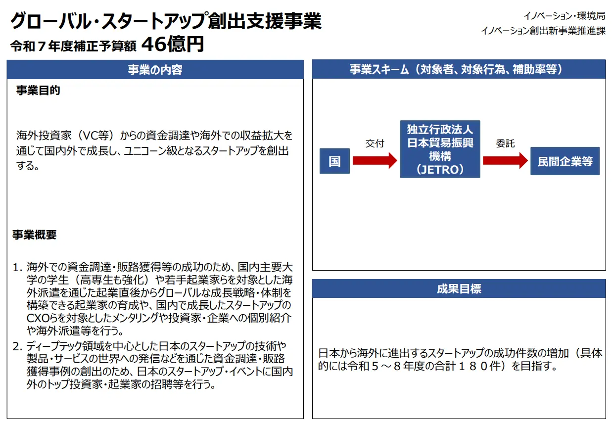 グローバル・スタートアップ創出支援事業では、海外投資家からの資金調達や海外市場での事業展開を見据え、日本発スタートアップのグローバルな成長を後押しする枠組みが整えられた。