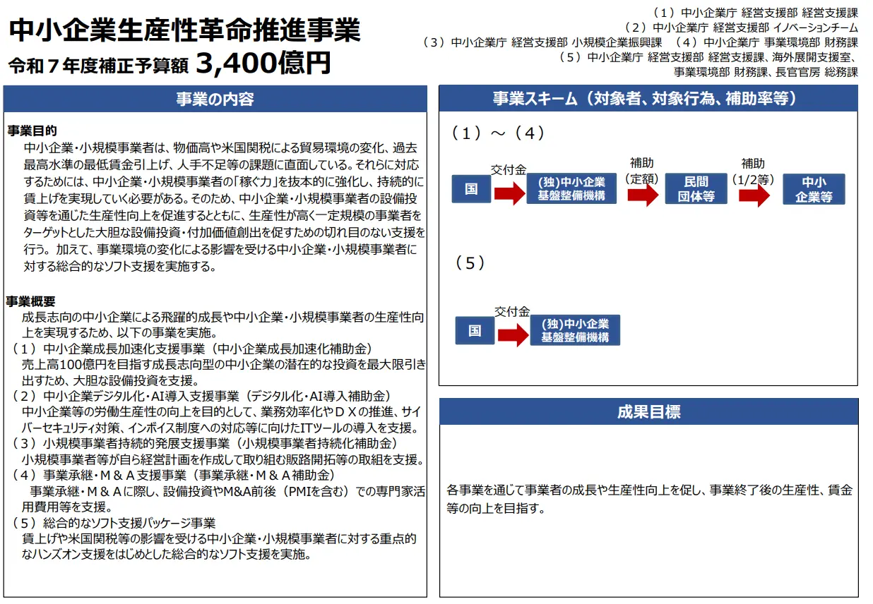これらは、中堅・中小企業が直面する生産性向上の壁を超えるため、デジタル化や新事業投資、スケールアップを後押しする重要な支援策として位置づけられる。
