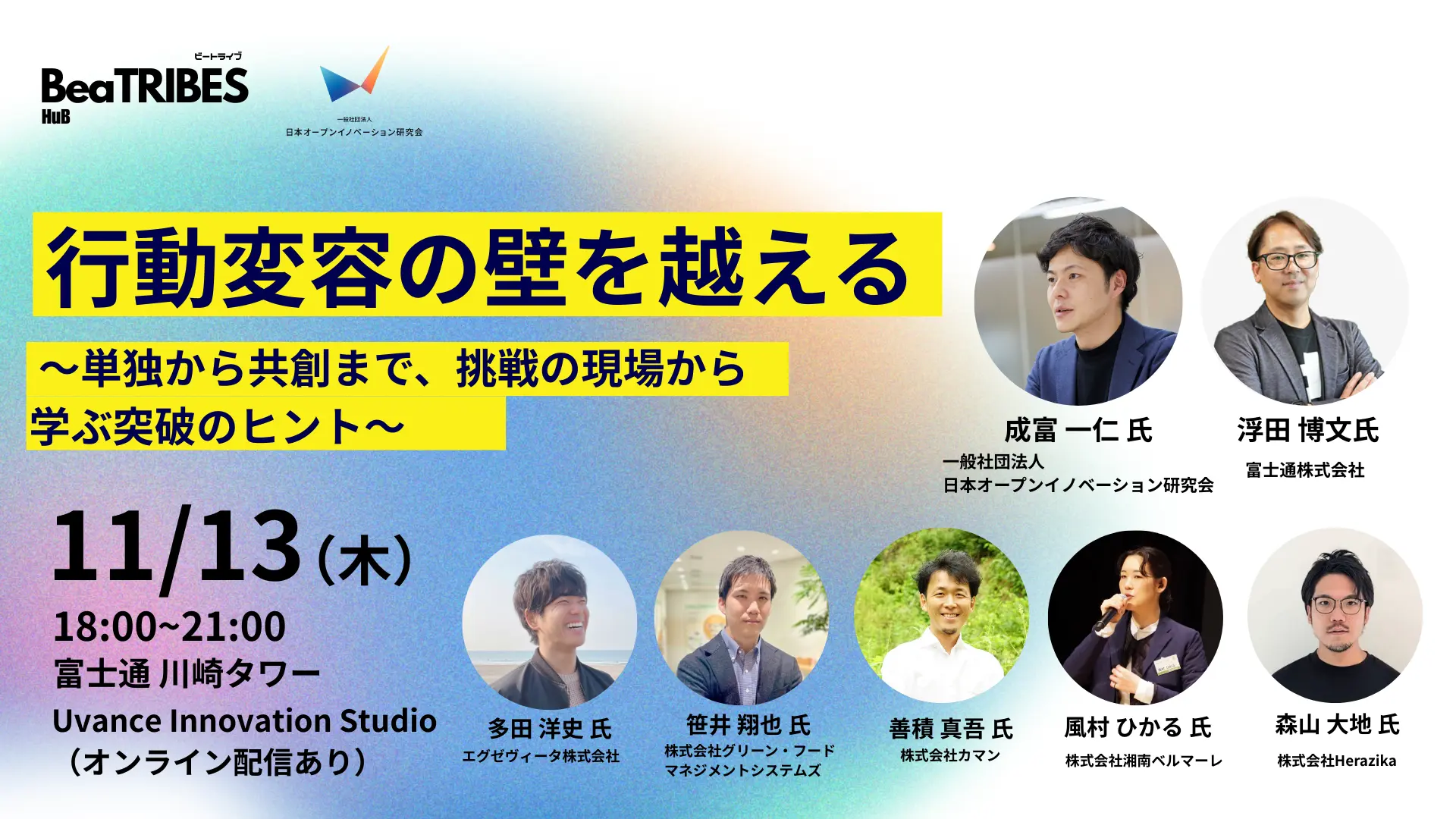 会場となったのは、富士通が立ち上げた「Uvance Innovation Studio」。ビジネスコミュニティ「BeaTRIBES」を運営するリトライブ株式会社とJOIRAの共催で行われた本イベントは、「行動変容」をキーワードに、企業単独の取り組みから他社・他地域を巻き込んだ共創プロジェクトまで、実践者の知見を共有する場として企画された。成富氏は、ピッチを行った3つの共創事例について的確なアドバイスやコメントを投げかけた。その模様をレポートしていく。