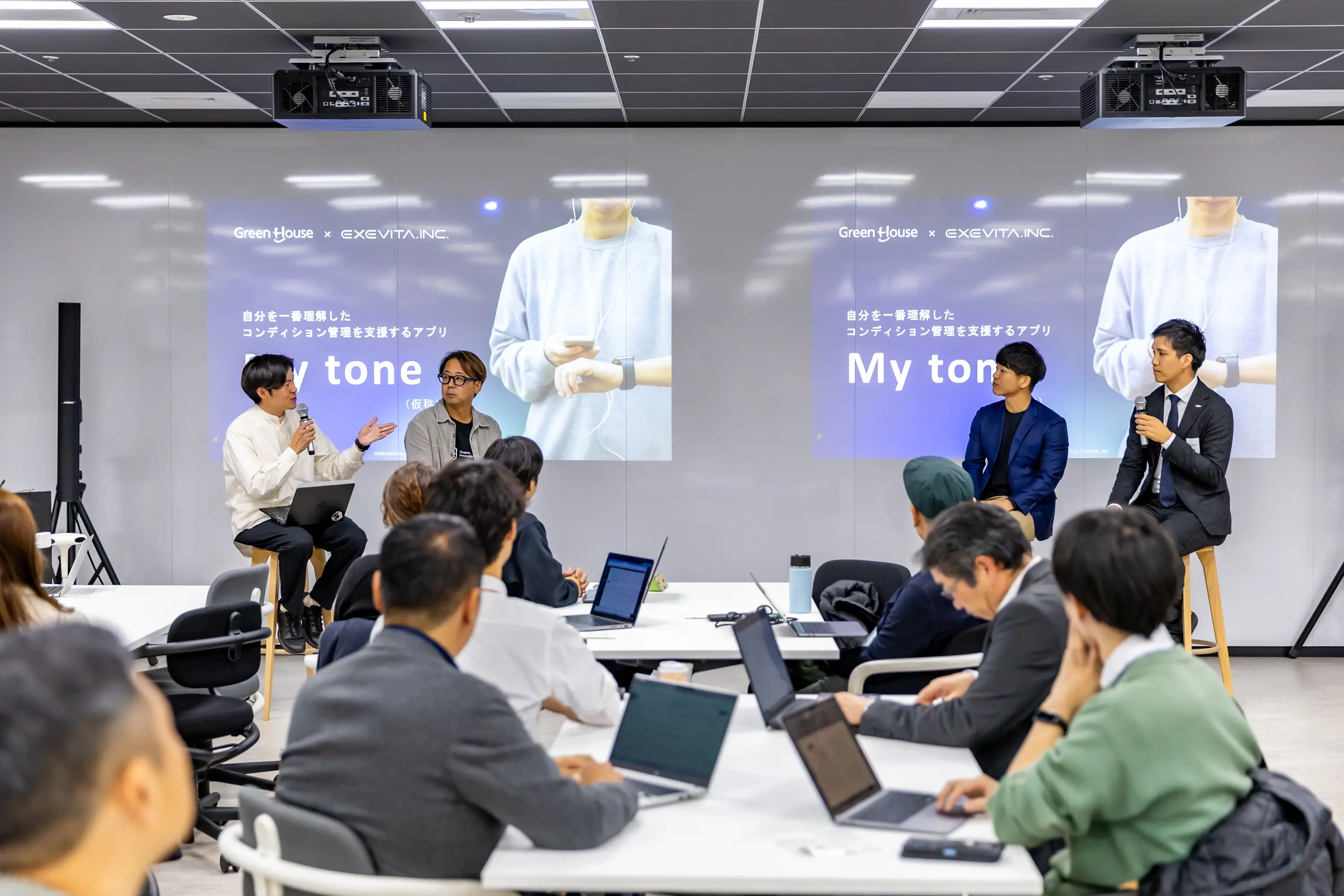 最初に紹介されたのは、エグゼヴィータ株式会社と株式会社グリーンハウスによる共創プロジェクトである。テーマは「健康経営」と「行動変容」の掛け合わせだ。