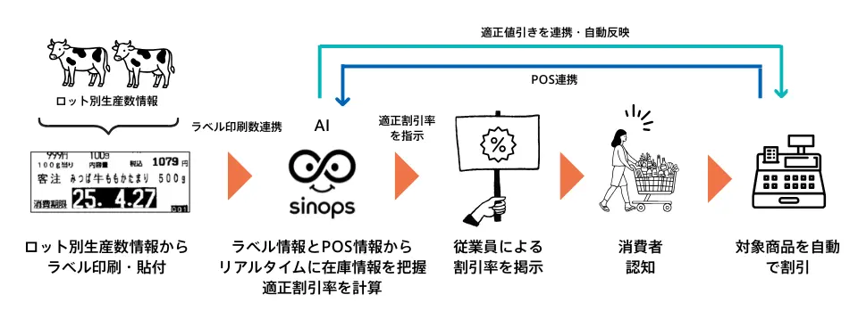 二つ目の実証は、販売段階でのダイナミックプライシングだ。精肉売り場では、値引き判断が担当者の経験に依存し、作業負荷や処理遅れが廃棄につながるケースも多い。今回の実証では、消費期限別に算出した値引率をPOSに自動反映し、値引きシールの貼付を不要とする仕組みを導入した。