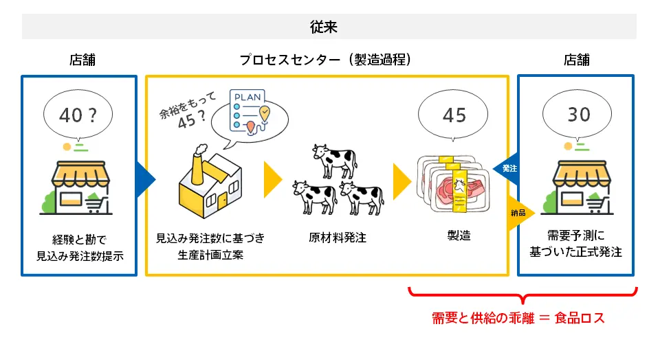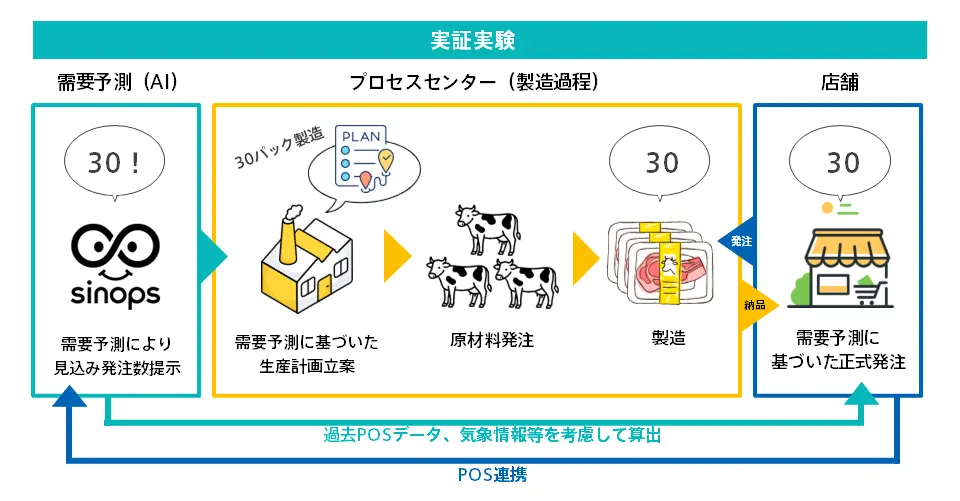 実証の一つ目は、精肉を一括加工するプロセスセンター(PC)に需要予測情報を共有し、原材料の仕入れ・製造計画を最適化する取り組みだ。従来、PCでは店舗の見込み発注を基に製造量を決めていたため、需給のズレが食品ロスに直結する課題があった。