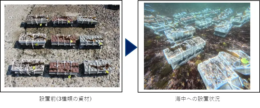 今回設置された実験区では、海藻の着生や成長を促進する基盤素材の効果を比較検証する。具体的には、城ヶ島と真鶴の同一地点に、形状の異なる3種類の資材を設置した。