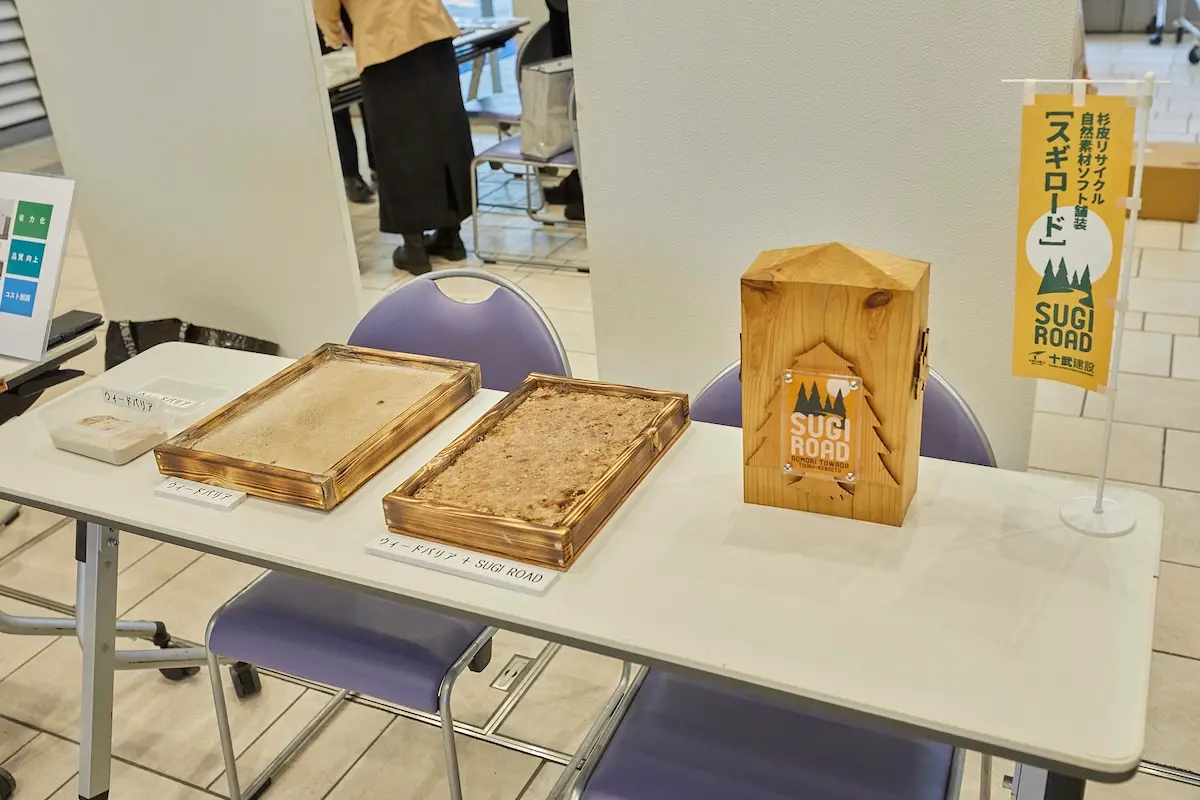 ホスト企業の十武建設は創業70年、公共事業を中心とした土木工事企業だ。同社では、独自に開発し特許取得済みのソフト舗装「SUGI ROAD」事業を展開している。SUGI ROADは、杉を製材・加工するときに排出される杉の樹皮(バーグ)に酸化マグネシウムを加えて加工した舗装材だ。すでに青森県内外の公園や遊歩道などで多くの施工実績がある。