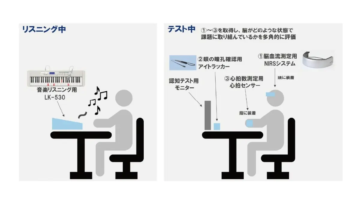 実験は2025年10月21日から11月6日にかけて、カシオ計算機の羽村技術センターで実施された。被験者は30名。被験者には「LK-530」に収録された楽曲を聴取してもらいながら認知課題を実施し、脳血流測定用NIRSシステム、心拍センサー、アイトラッカーを用いて脳活動や生理指標を測定した。テンポの異なるクラシック曲(BPM150、BPM60)のほか、メトロノーム音や無音条件などを比較し、作業効率や脳活動パターン、心拍変動、瞳孔反応などを分析した。