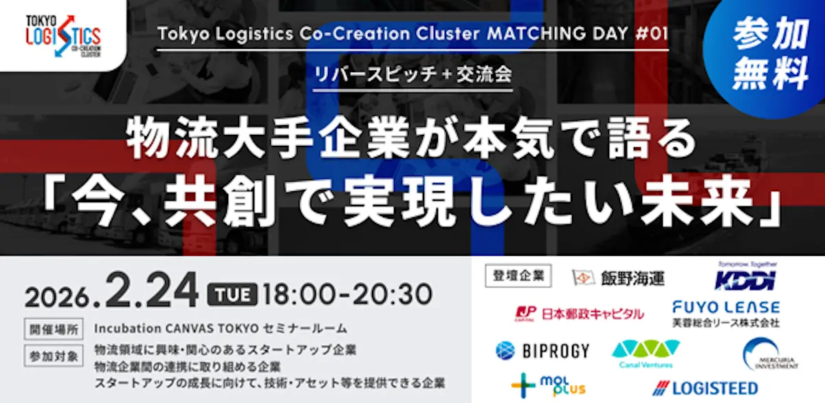 物流は今、構造転換の入口に立っている。人口減少、人手不足、脱炭素、複雑化するサプライチェーン——単独企業では解決しきれない課題が顕在化し、大手企業が「実装前提」でスタートアップとの共創に踏み出している。その起点となる「Tokyo Logistics Co-Creation Cluster(以下、TLCC)」のイベント「MATCHING DAY #01(リバースピッチ+交流会)」が2月24日、Incubation CANVAS TOKYOで開催された。
