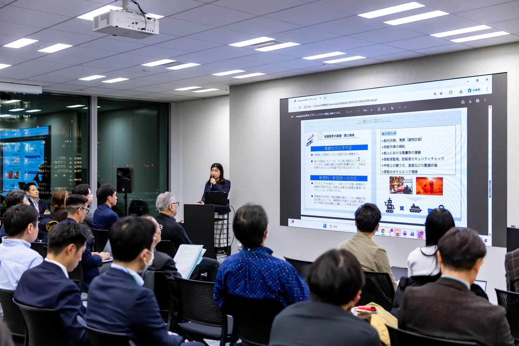 提示したのは海運業界が抱える2つの巨大な課題だ。1つ目は「高齢化と人手不足」。海運業界も船員不足に直面している。日本における新たな内航船需要も相まって、内航船では今後10年間で1万人以上が不足する予測もあるという。安定した物流が崩壊する可能性も示唆した。2つ目は「新燃料・新技術への対応」だ。アンモニアや水素などの新燃料は取り扱いが難しく、安全管理にテクノロジーの力が不可欠となっている。また、業界では自律航行技術の開発が進む一方で、入出港作業やエンジン管理など、完全に無人化できない細かな業務も多く残されている。