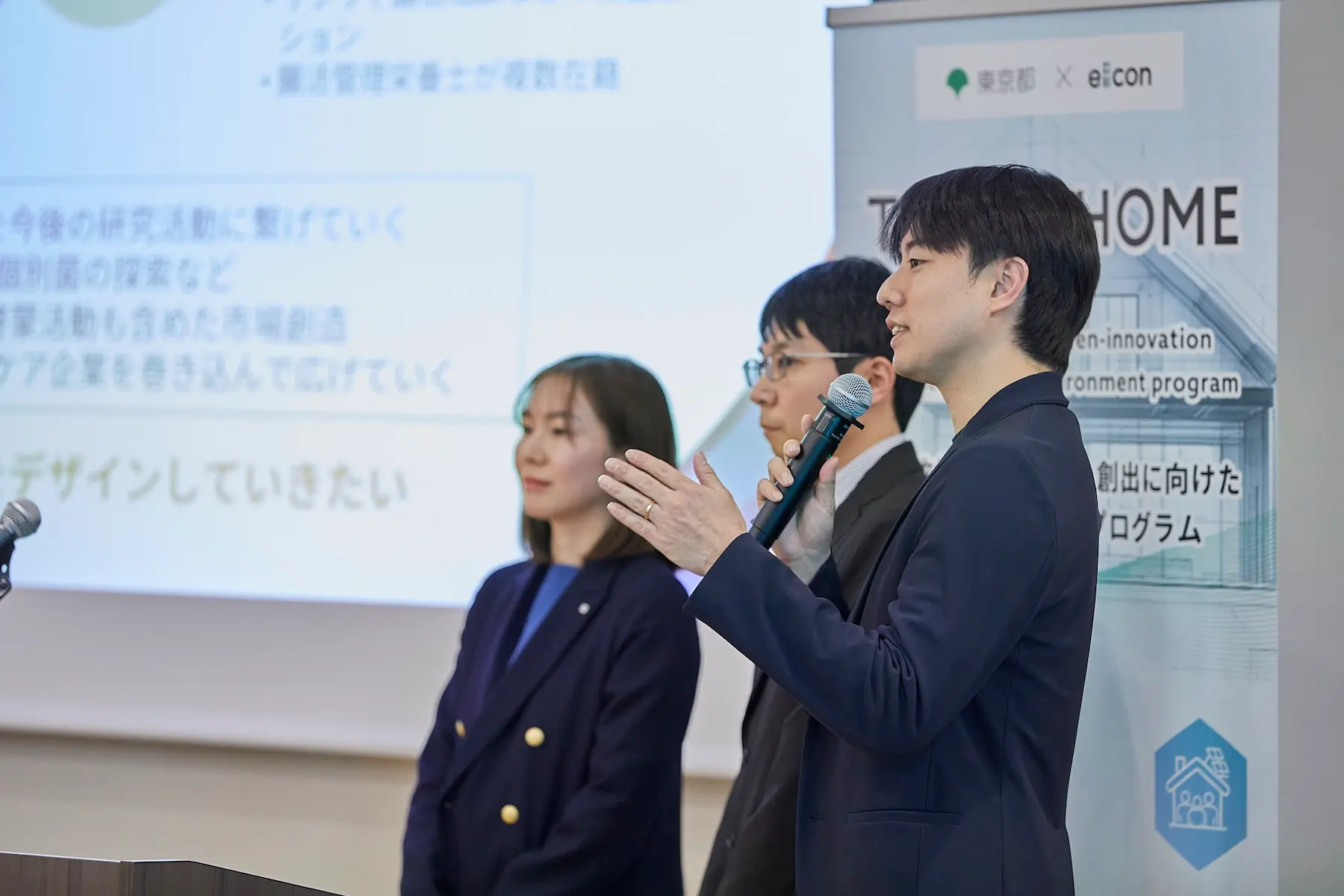 ▲3月12日に行われた成果報告会で、YKK AP・小沼氏とともにピッチを行った水町氏と伊藤氏。