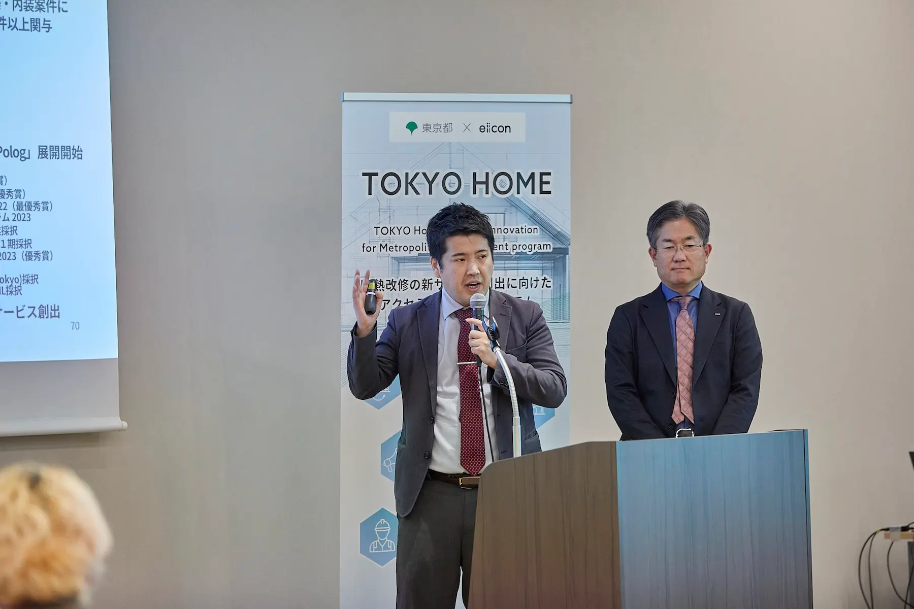 ▲3月12日に行われた成果報告会で、LIXIL・渋谷氏とともにピッチを行った本田氏。