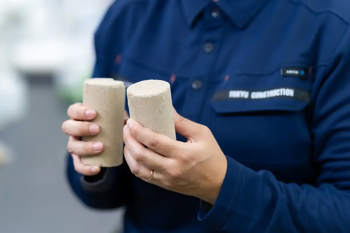 ▲東急建設は、廃棄される資源を活用した環境配慮型建材の開発に取り組んでいる。これは、地盤改良材で軟弱土を固形化したものだ。