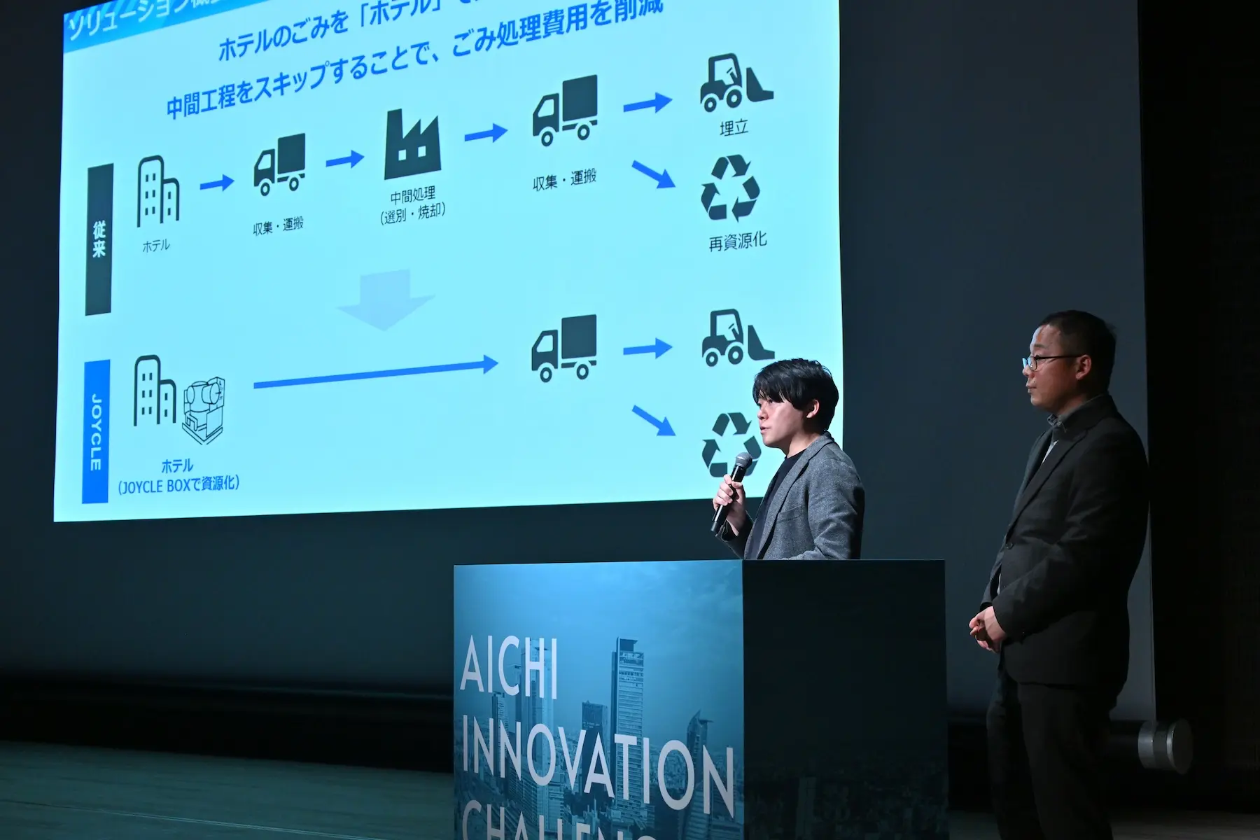 JOYCLEは、廃棄物を現場で処理・再資源化する装置「JOYCLE BOX」と管理ソフト「JOYCLE BOARD」を開発するスタートアップ。同社は、ホテル敷地内に装置を設置し、分別不要で生ゴミを処理することで中間処理工程を省略し、廃棄コスト削減を図るソリューションを提案した。