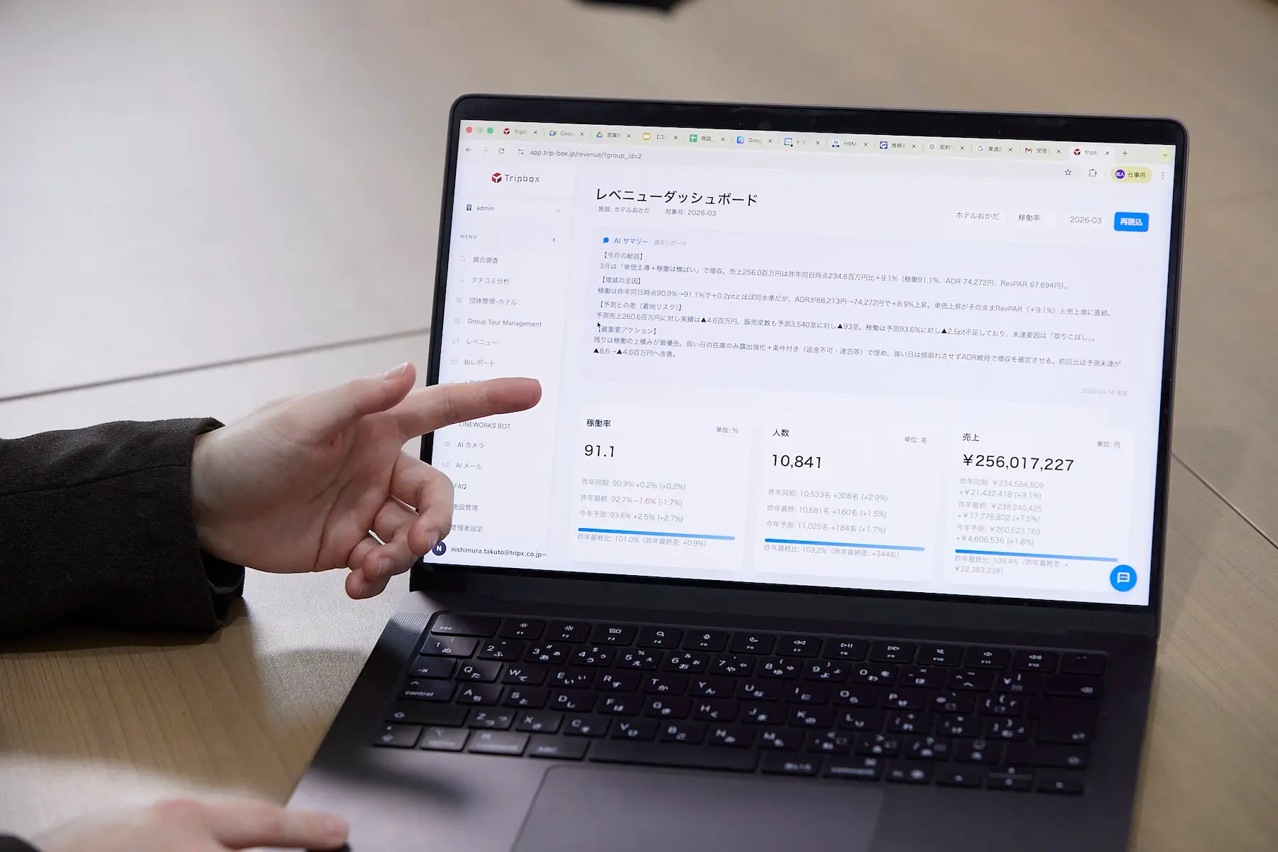 ▲旅館経営におけるすべての重要指標を俯瞰できるダッシュボード機能など、属人性に頼らない”強い旅館経営”を支援する「Tripbox」。