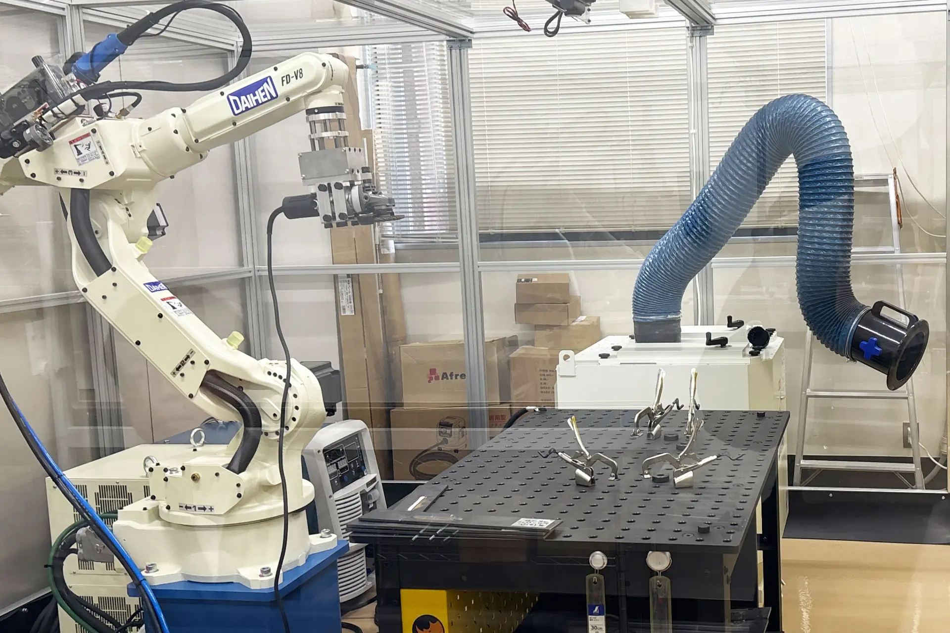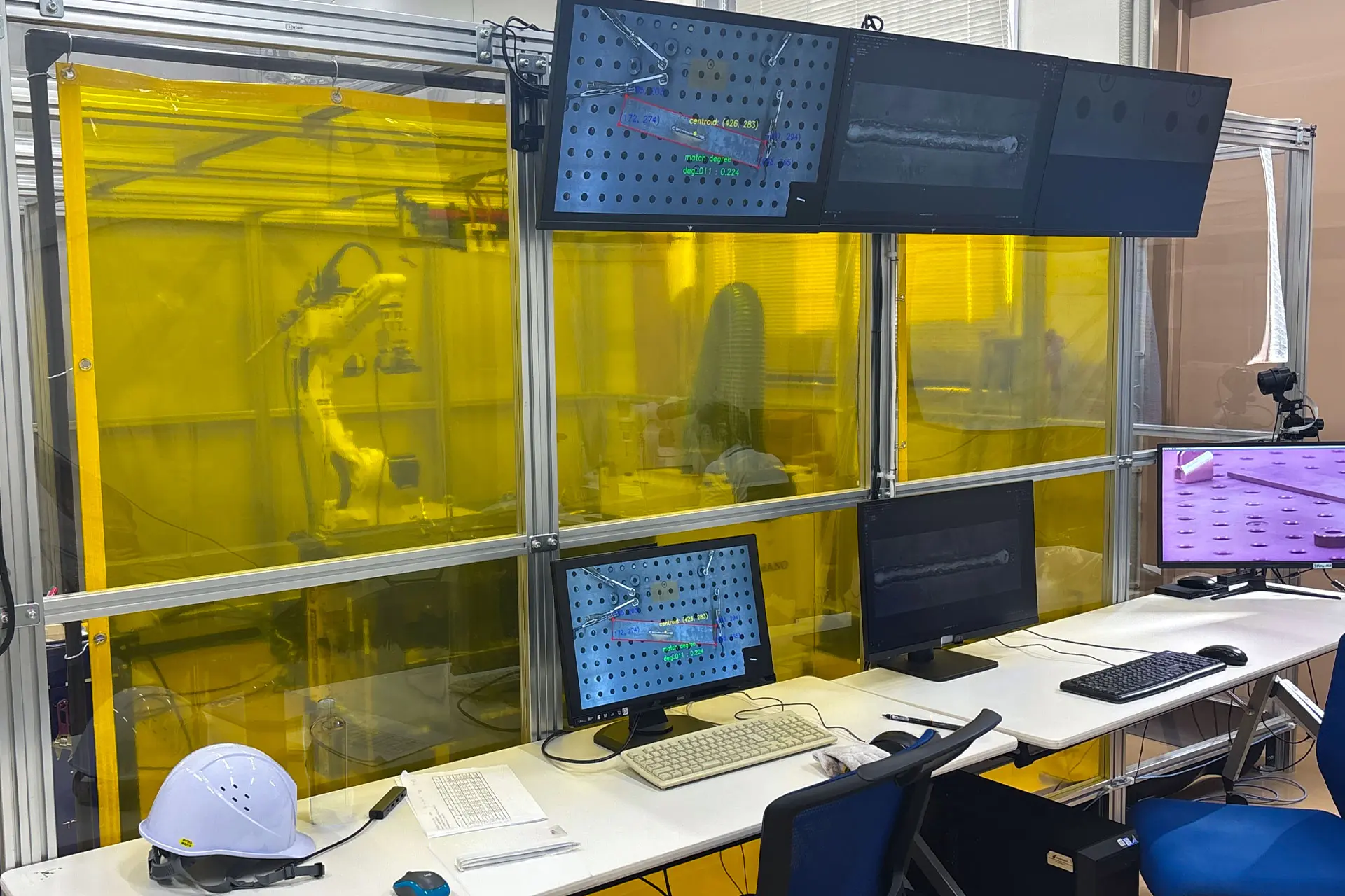 京田辺ロボティクスラボの特徴は、実機とデジタル技術を高度に統合した検証環境にある。施設内には、産業用多関節ロボットやデジタル溶接機、AI画像認識と連携する協働ロボットなどが配備されている。