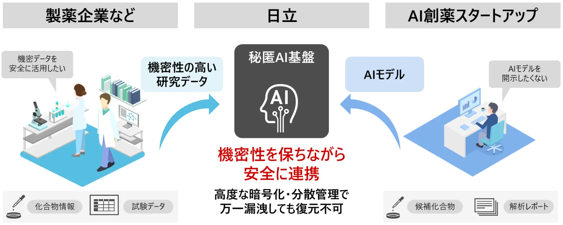 株式会社日立製作所(以下、日立)は、AI創薬におけるオープンイノベーションを加速する「秘匿AI基盤」の開発に着手した。AI創薬スタートアップの株式会社MOLCUREとの協創を通じ、2026年度からのサービス提供を目指す。
